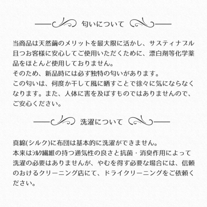 SHAMYMOONの真綿布団生産工程では天然シルクをより良いコンディションで提供するために、化学薬品による脱染色等を最低限まで控えております、そのため天然特有の繭の匂いが残っていますので、ご使用前によく風に晒すことをお勧めしております。