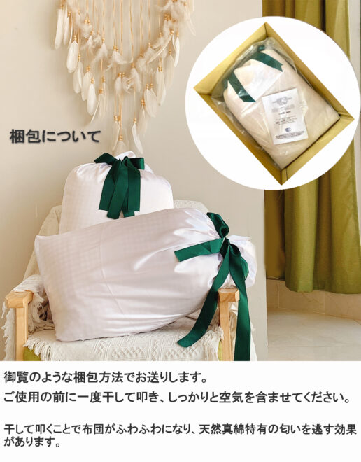良質の繭のみ使用し、脱色・染色をしない、伝統手工法による手間のかかる生産ですが、大量生産品では実現できないクオリティーの掛けふとんをご提案いたします。